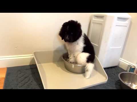 Thirteen-week old Landseer pup Dethan gets a bigger water bowl.